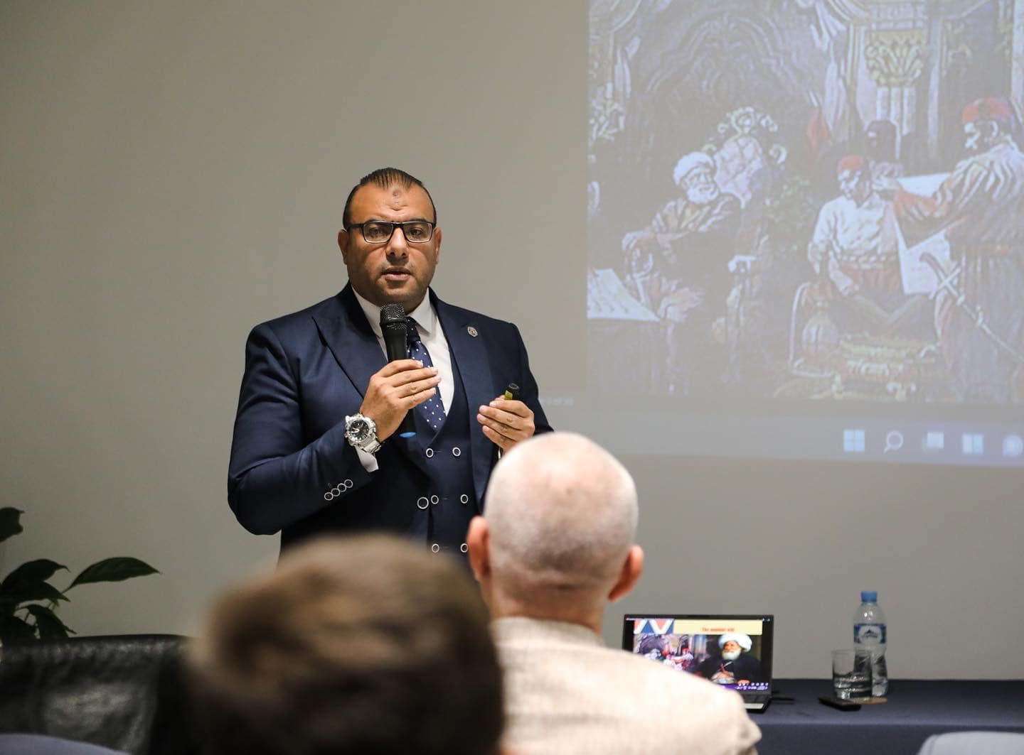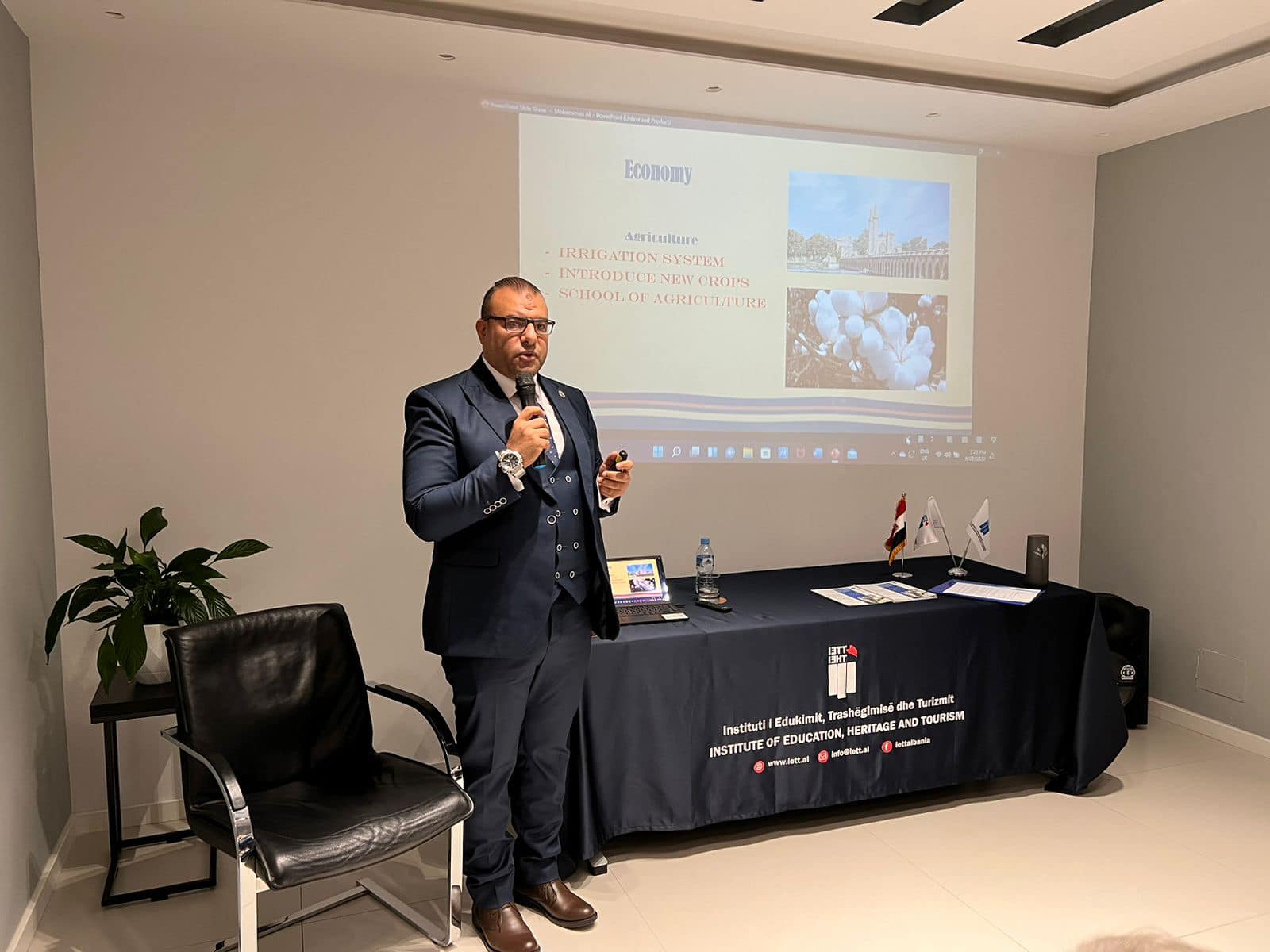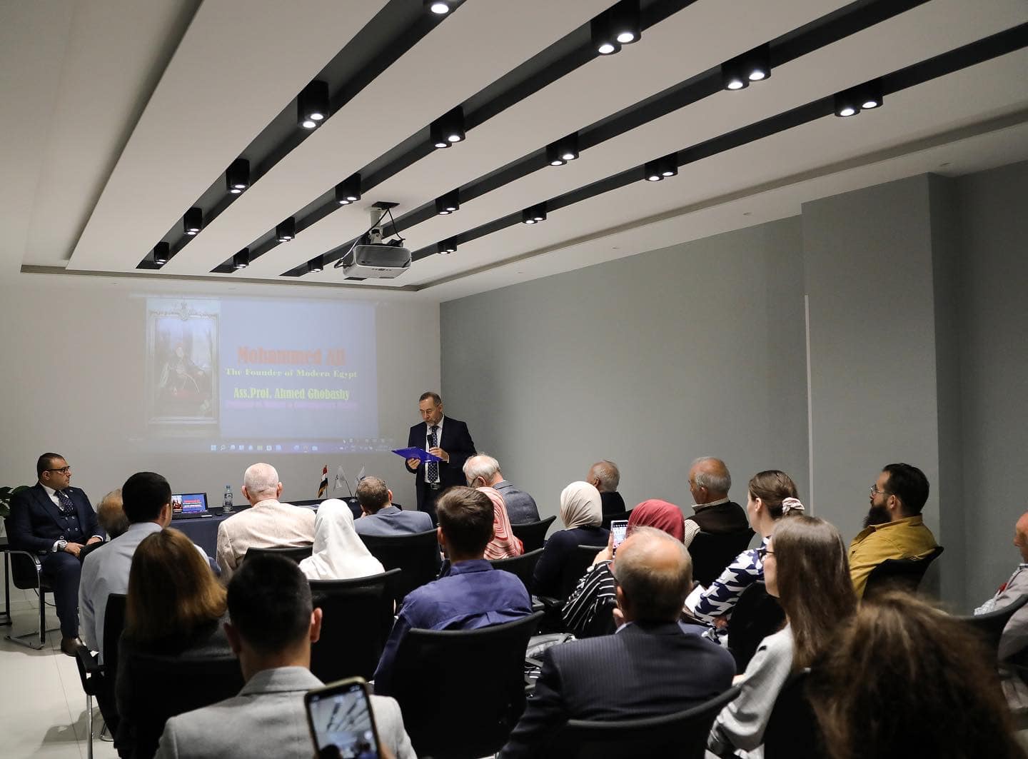 Prof. Ahmed Ghobashi then continued with his lecture, where he spoke about the origins of bilateral relations between Egypt and Albania, Muhammad Ali of Egypt — considered the founder of modern Egypt — and the reforms he undertook in various sectors, which consequently brought about a rich Albanian diaspora.