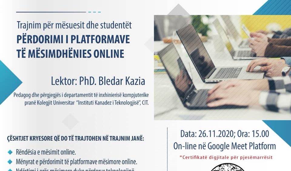 Instituti i Edukimit, Trashëgimisë dhe Turizmit, IETT në kuadër të marrëveshjes së bashkëpunimit me “Instituti Kanadez i Teknologjisë”, CIT organizuan trajnimin për mësues dhe studentë: PËRDORIMI I PLATFORMAVE TË MËSIMDHËNIES ONLINE
